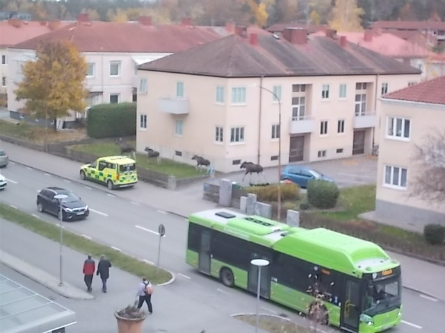 Hela familjen Älg var ute på stadsbesök. De föstes nu vänligt men bestämt åt rätt håll av en ambulans på trottoaren och en polisbil på gatan såg till så de inte fick för sig att kliva ut i trafiken. Igen. Här kommer en tidningsbild på sällskapet som i alla fall går över på övergångsstället till skillnad från många tvåbenta. Men sen blir det ju lite stökigt.