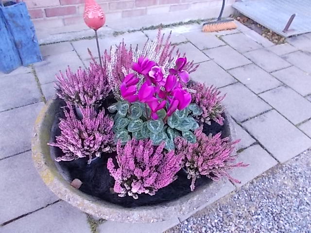 Nu känner jag att det är dags att ge er något vackert att se på som avslutning på det här inlägget. Det är en av mina grannar som är otroligt duktig med blommor och planteringar. Min raka motsats alltså. Bilden är tagen för några veckor sedan så blomstren i mitten frös och är utbytta mot annat. Men det är ändå så vackert i färgerna.