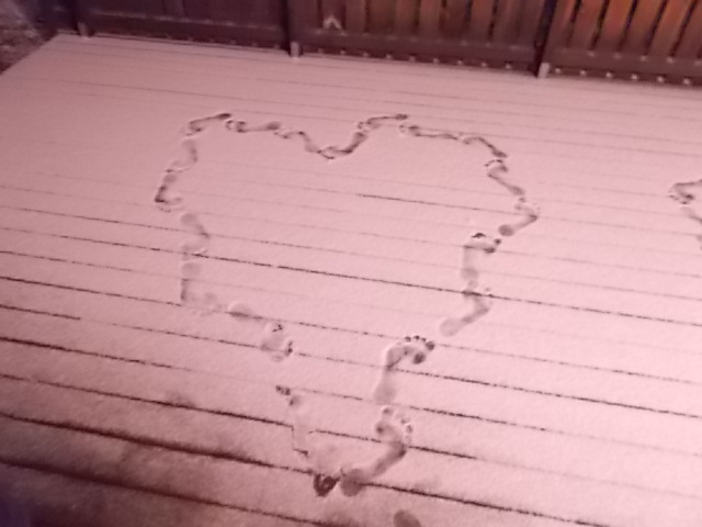 Jag brukar ju trampa upp ett barfotahjärta varje år när första snön kommer. Det gick inte i år för det regnade en hel dag och på morgonkvisten snöade det lite och frös på. Det blev is direkt. Så hård skare så det gick inte att trampa upp ett hjärta.