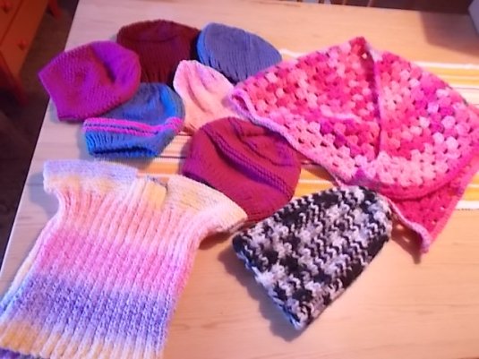 Här är det gott och blandat med mössor som jag stickat och en halsvärmare. Längst fram ligger kläder från Vinton . Allt skickades i ett paket till Ingrid på Slättmissionens Hjälpande Hand. Där fördelas det till Rumänien och Ukraina.