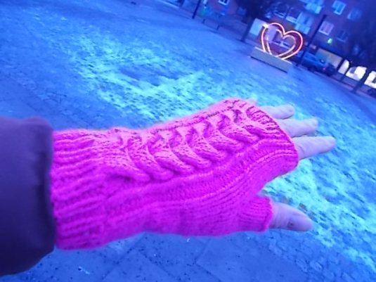 Visst är dom fina med en stor tjock fläta och allt. Jag väntade på bussen från Torshälla till stan och tog kortet och inte förrän efteråt såg jag att jag fick med det lysande hjärtat som stod på torget. Rosa torgvantar i all ära men titta här så snitsigt det blev ihop med mina knallrosa dojor.