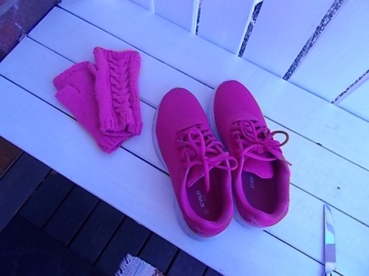 Ni kanske minns att jag hade ett par illrosa sneakers förra året. Jag gillar ju rosa och när jag var på julmarknad i Torshälla förra året så kilade jag in i garnaffären och köpte ett nystan rosa garn och gav till min marknadskompis E H och bad henne sticka ett par torgvantar åt mig. Du har ju flera par torgvantar sa hon och jovisst har jag det, lila, grå, mellanblå och mörkblå men inga rosa. När vi nu träffades för någon månad sedan så fick jag mina rosa torgvantar.